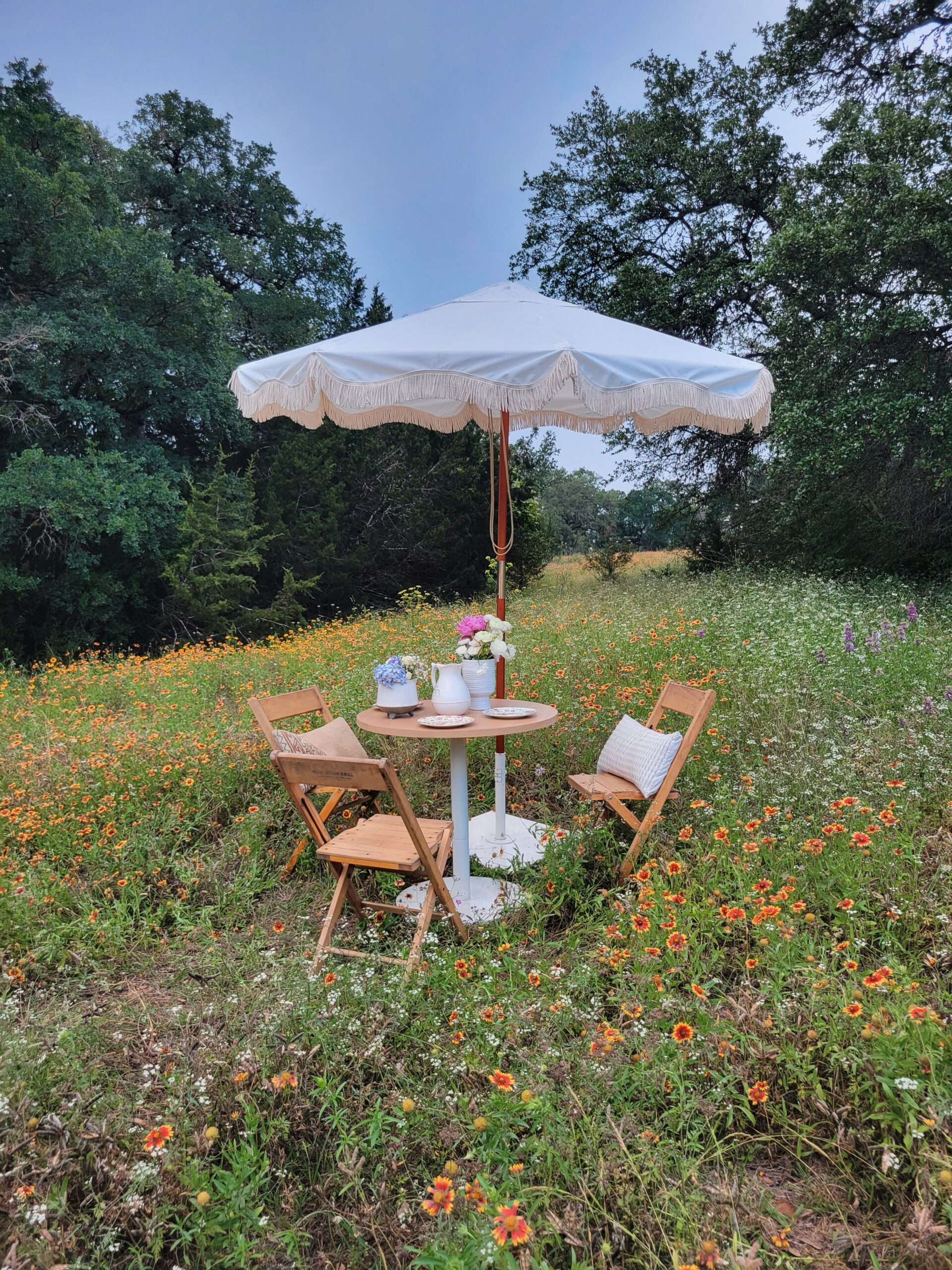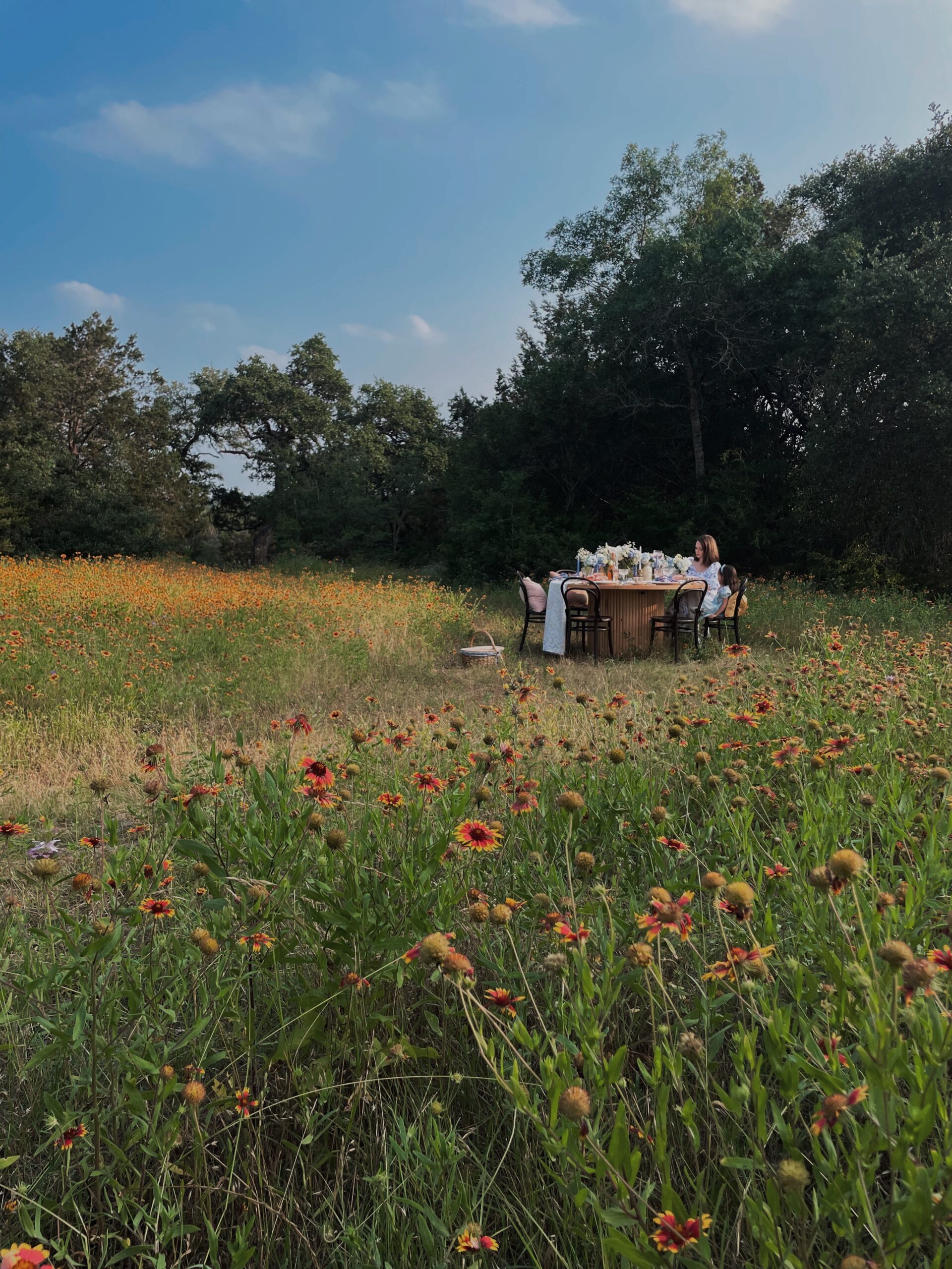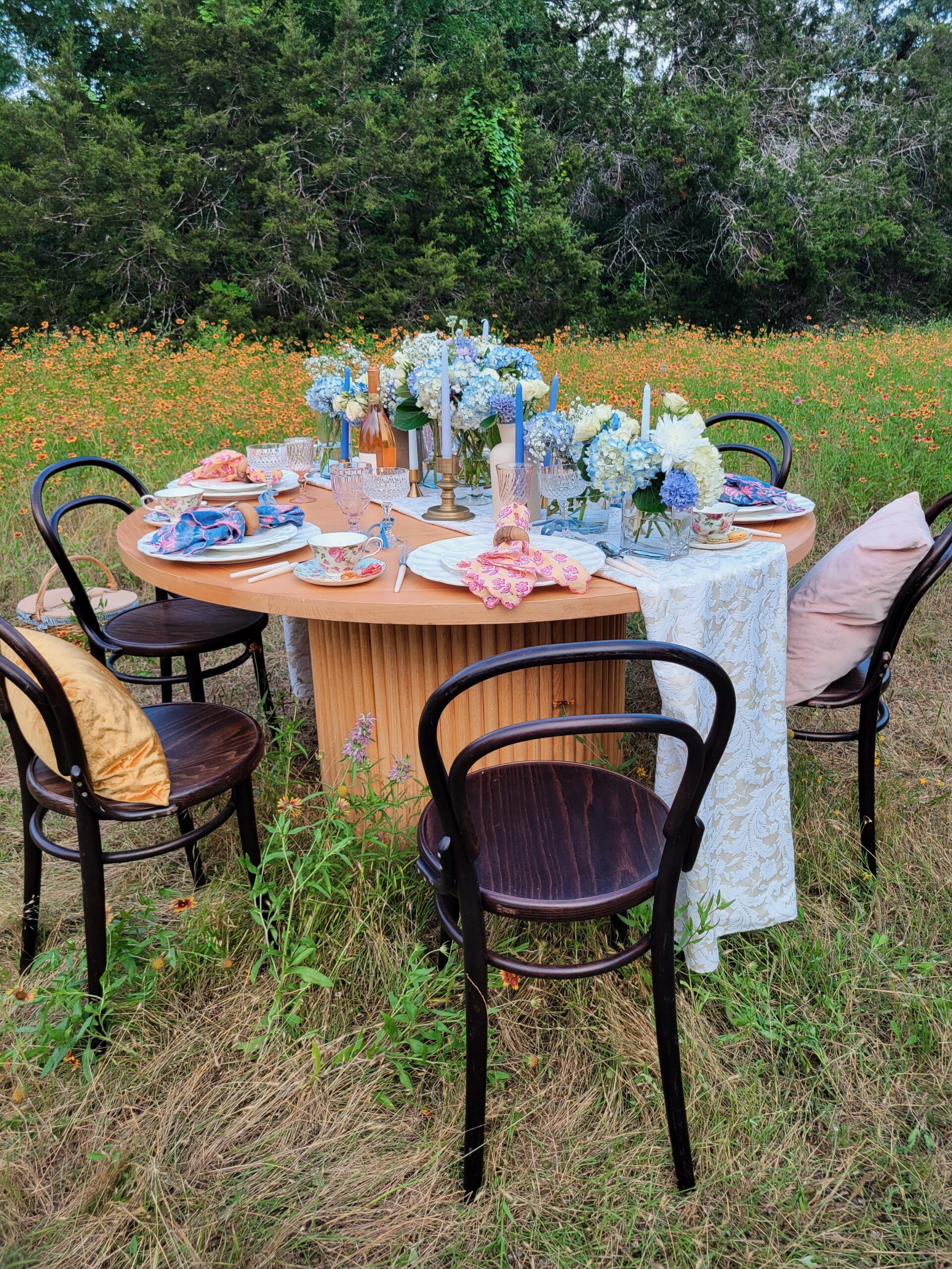 In anticipation of the Netflix hit show Bridgerton’s third season and Mother’s Day this year, we planned this romantic styled shoot in a field of wildflowers with Whim & Proper, an Austin event styling boutique, and Table Manners, Austin’s premiere table-top rental vendor. You may know our specialty is more modern-leaning furniture rentals and not so much ornate, antique pieces like you see in the television series but this styled shoot proves that we can definitely bring the romance.