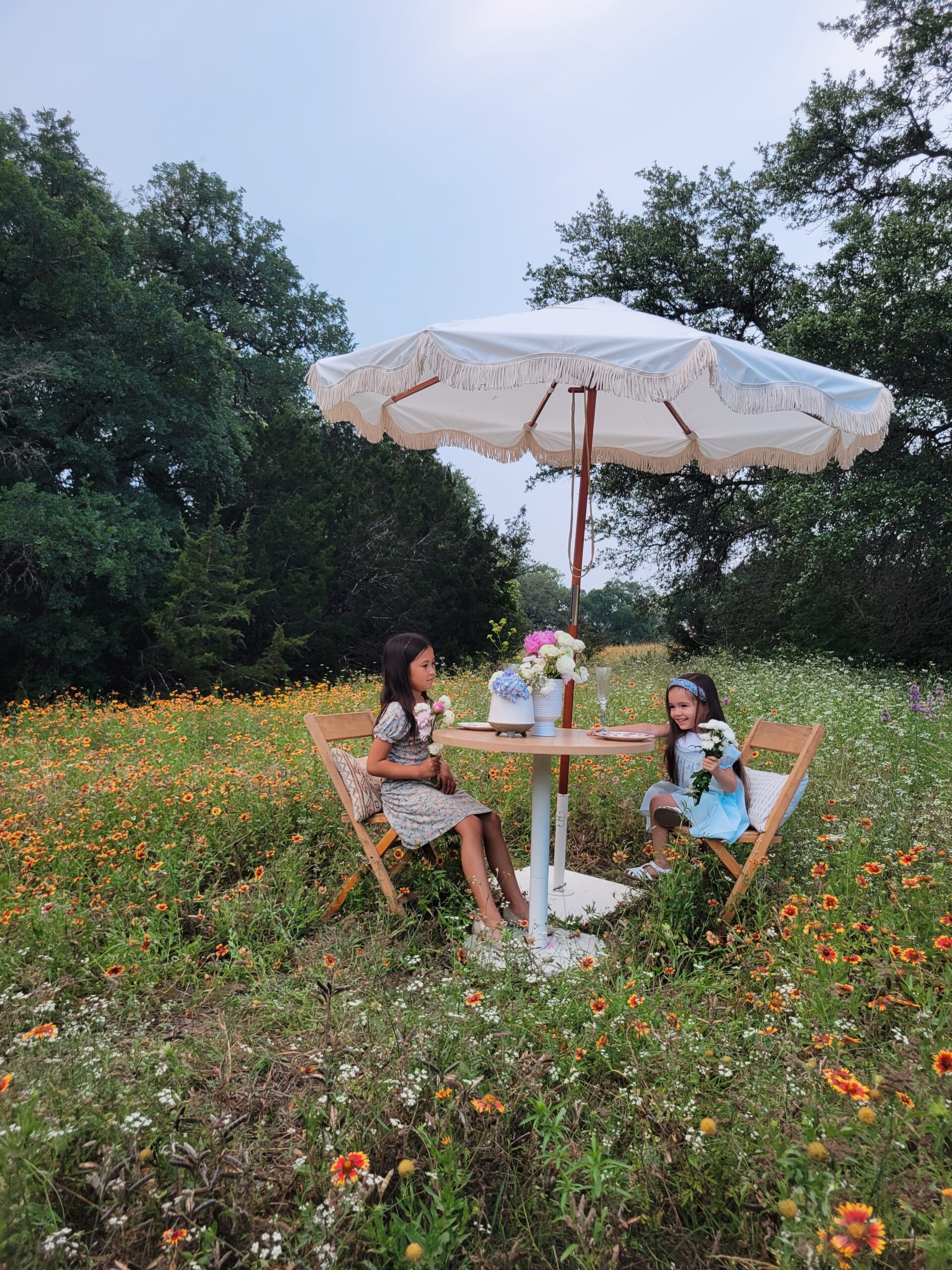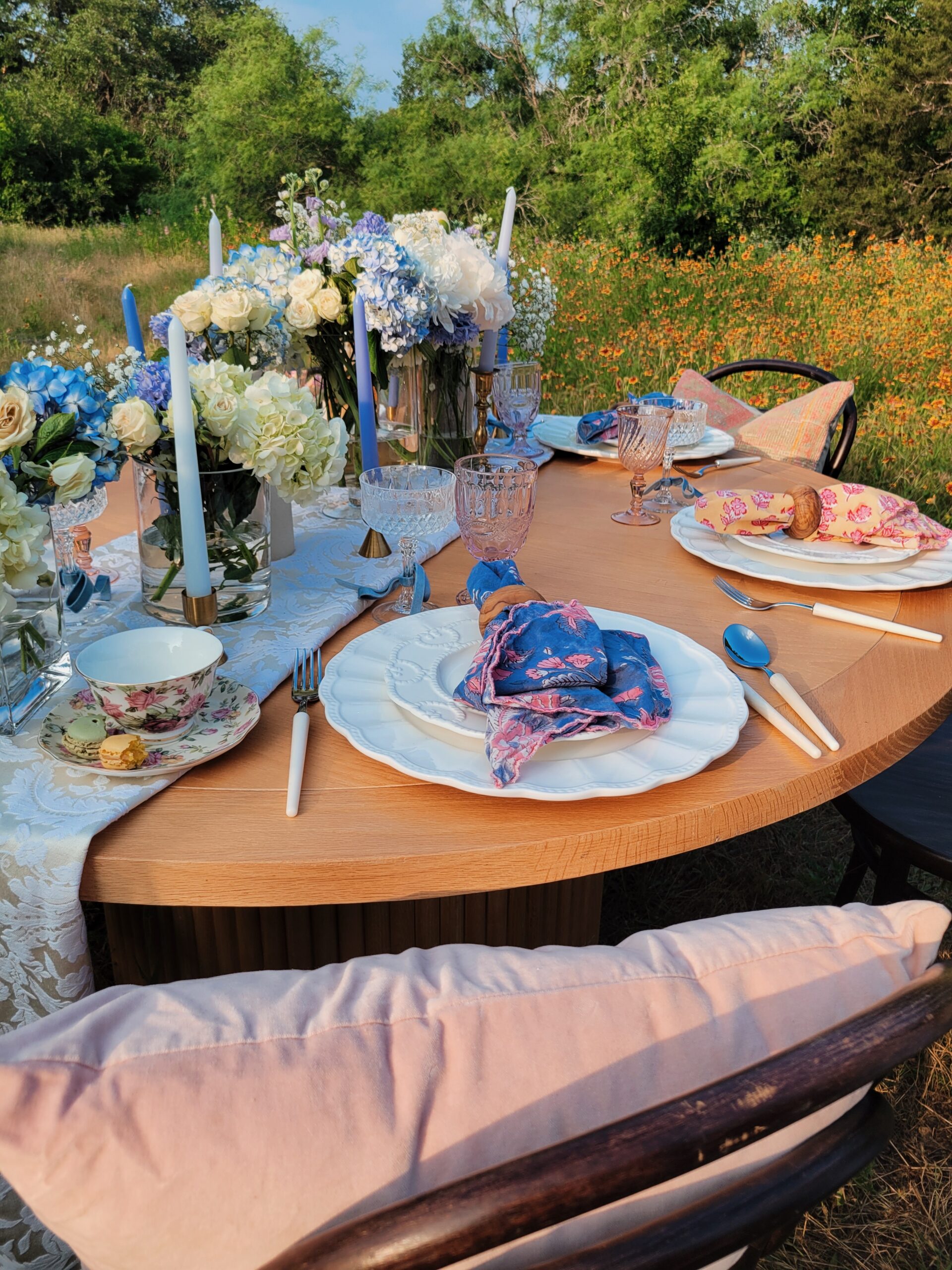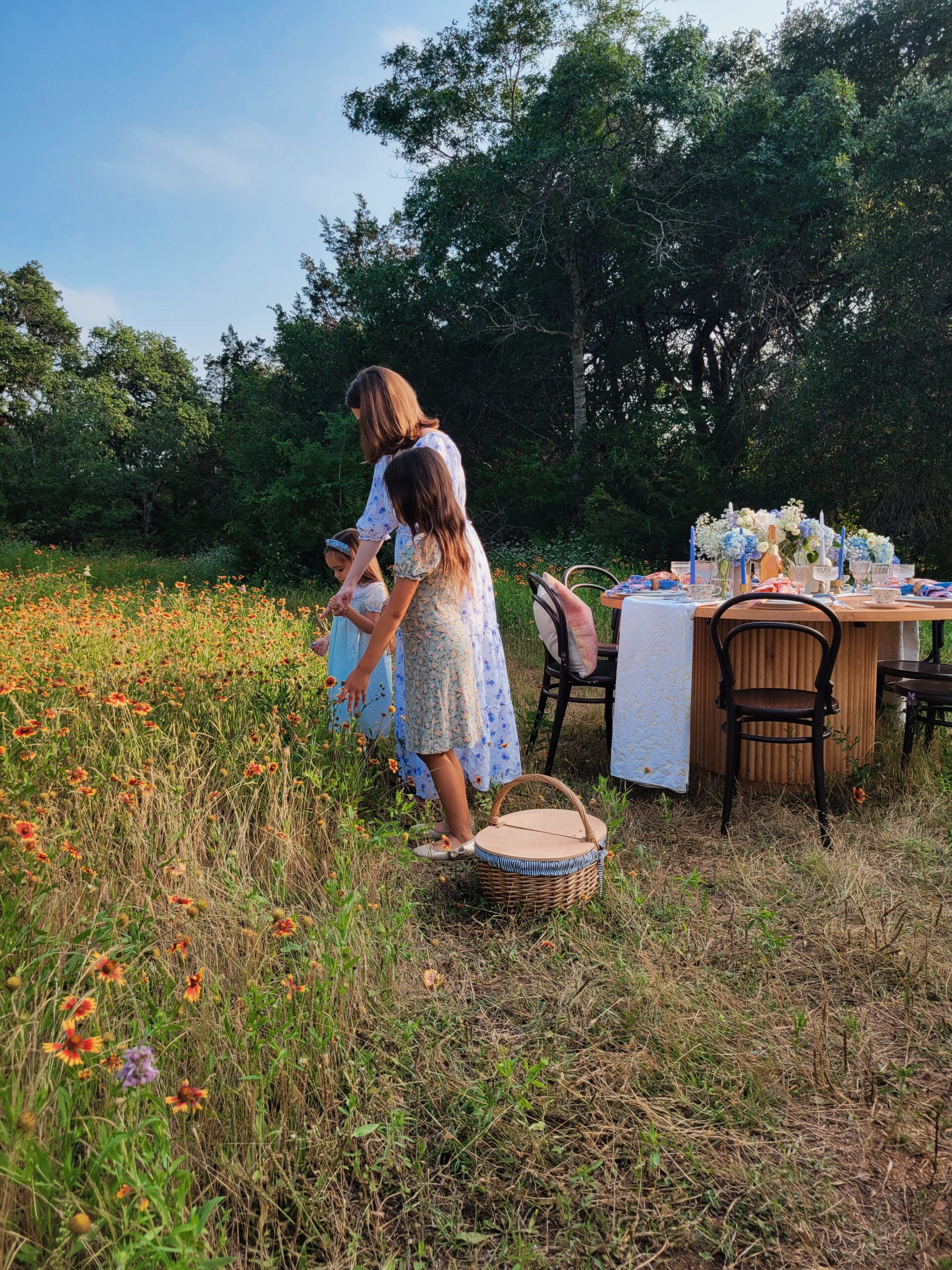 In anticipation of the Netflix hit show Bridgerton’s third season and Mother’s Day this year, we planned this romantic styled shoot in a field of wildflowers with Whim & Proper, an Austin event styling boutique, and Table Manners, Austin’s premiere table-top rental vendor. You may know our specialty is more modern-leaning furniture rentals and not so much ornate, antique pieces like you see in the television series but this styled shoot proves that we can definitely bring the romance.