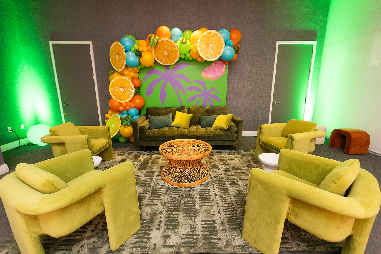 We turned downtime into a whole vibe with “flavored” lounges! Each monochromatic lounge had a 7×7‘ painted backdrop wall with vinyl decals. The flavors included Orange Blast, Lemonade, Green Apple and Hard Tea—can you guess which was which?