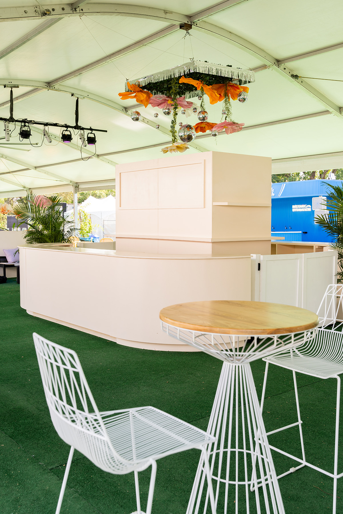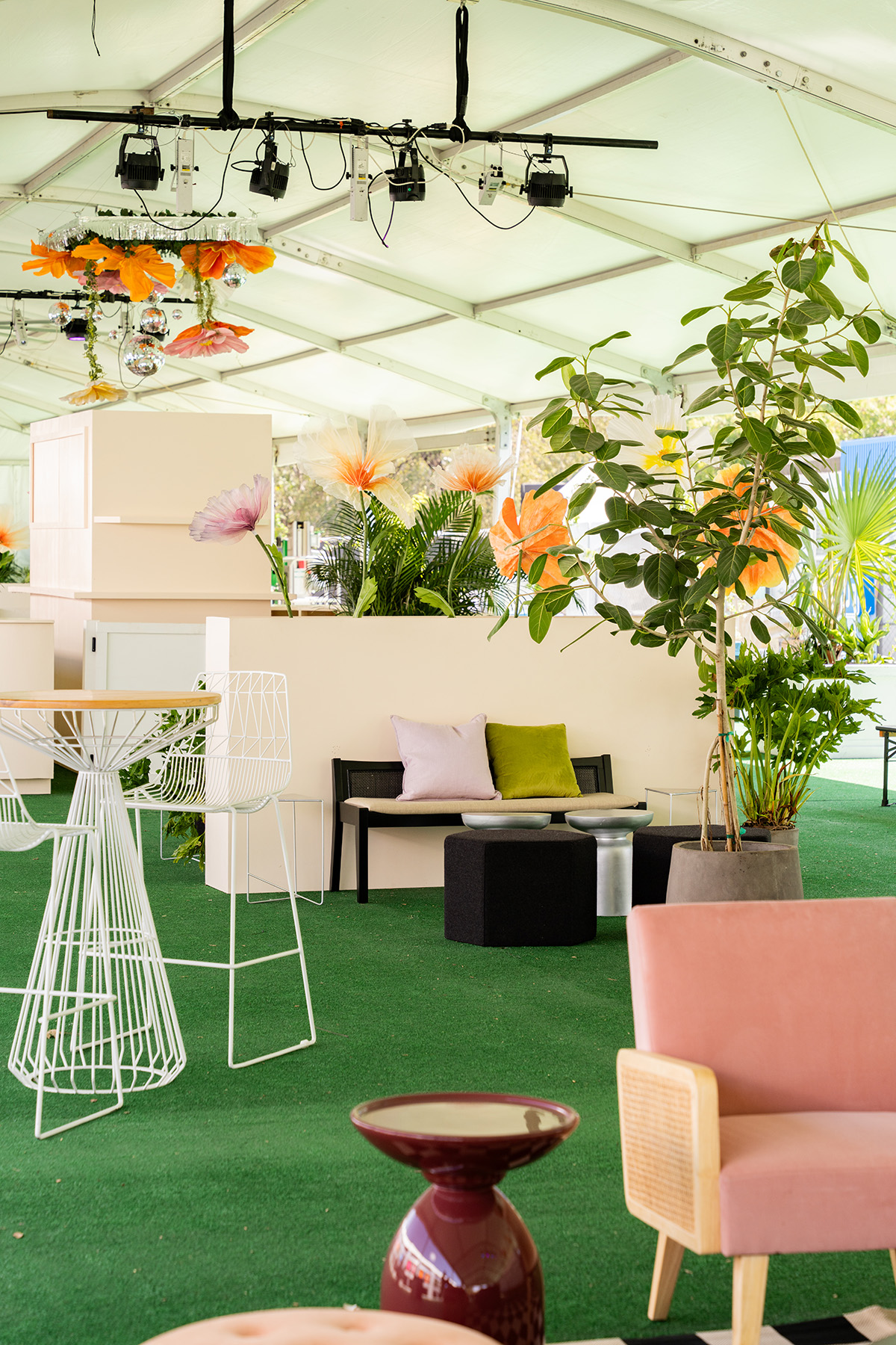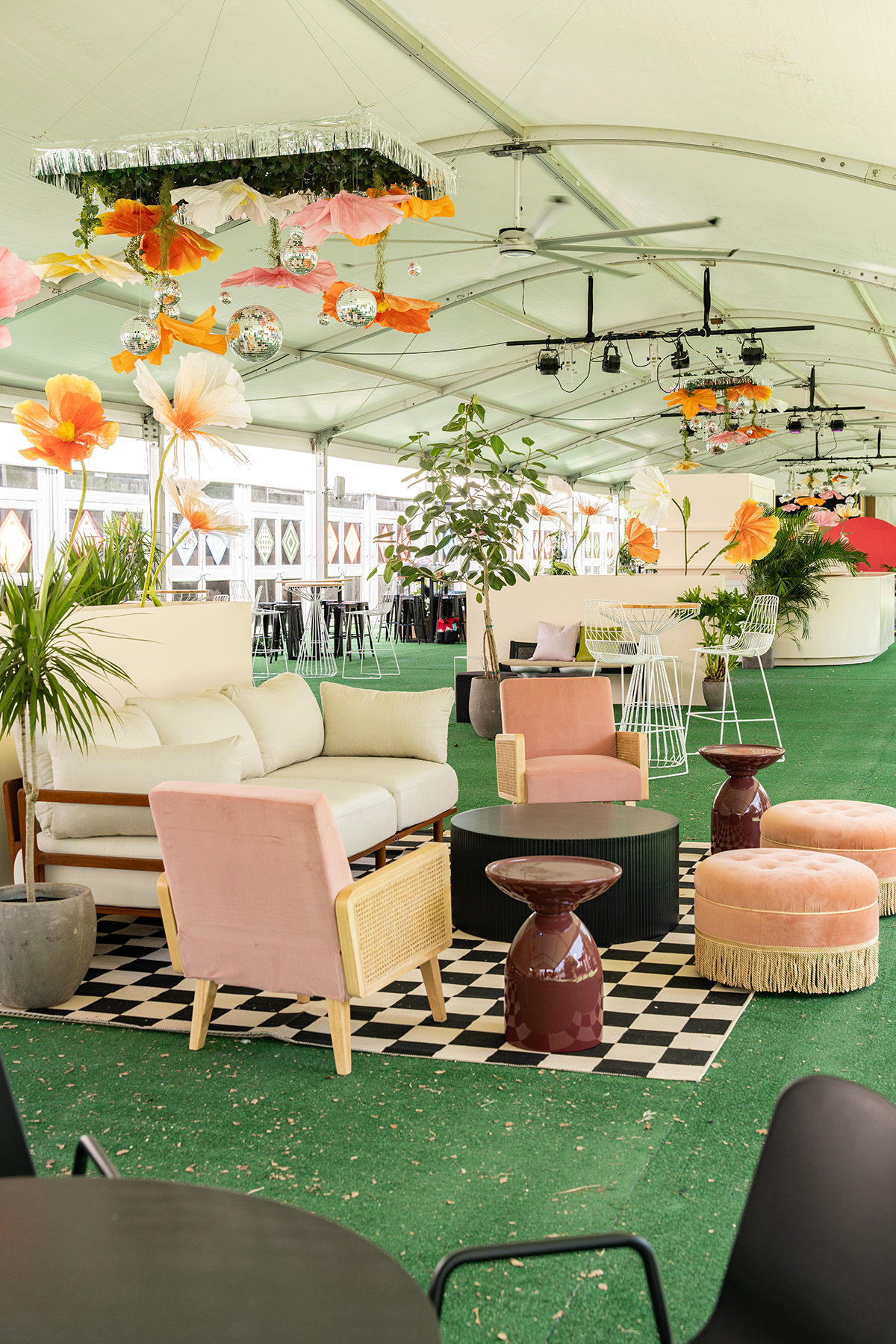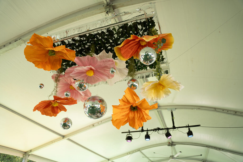 Another way to make a space feel cozier is by hanging decor which helps reduce the feeling of a tall ceiling—especially helpful to spice up a massive, white tent! We designed these hanging fixtures with dangling florals and disco balls to hover over the bar and large lounges. They introduced more color and personality and tied back to the florals in the planters. (An added bonus was the lights reflecting off the disco balls at night.)