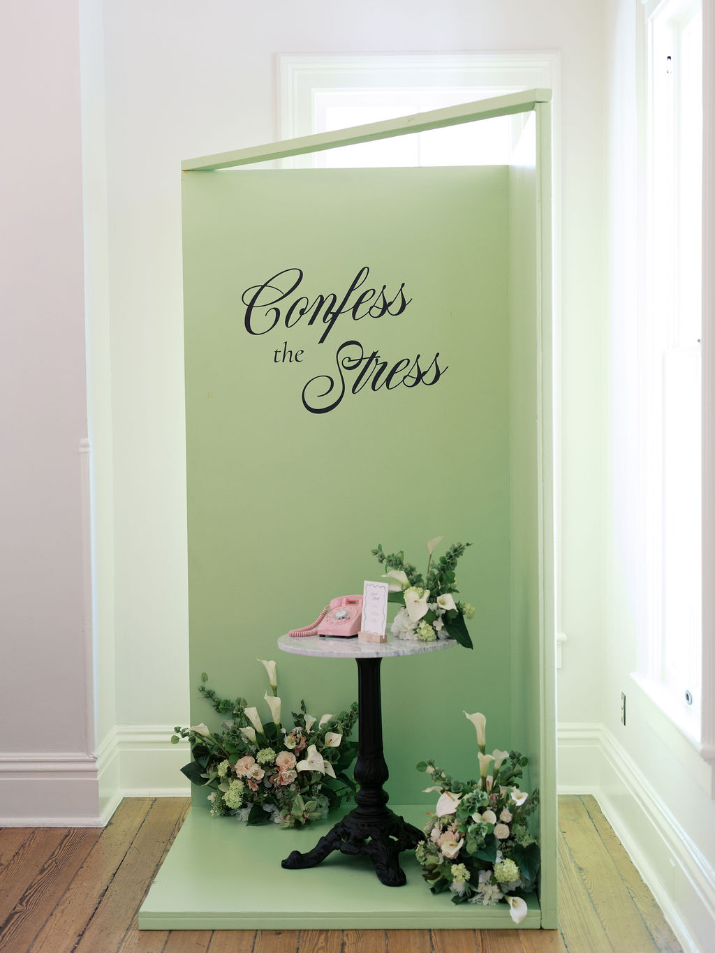 Think back to the last wedding you attended.. the part you probably remember the most was when you cried during the bride and grooms vows, or when you laughed with friends on the dance floor after a few glasses of champagne. Tapping into guests’ emotions creates memories and one emotion that most soon-to-be brides are feeling is unfortunately… stress. Revelry customized our Custom Color Photo Corner, with a calming shade of green and vinyl text, as a space where guests could “confess the stress” into a rotary phone.