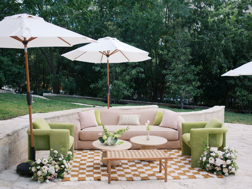 This category for us? No sweat. From the beginning, we’ve been transforming the atmosphere of a space with rentals. The key here is choosing rentals in colors and patterns that coordinate with all of the other decor you’ve chosen to provide a cohesive experience. Our Sales & Design Lead for this job selected our lime green Lime Drop Lounge Chairs and Lime Pillows to call back to the green in the photo op, paired with our Pink Lady Sofa, which brought in the feminine vibes needed to bring through the bridal shop brand.
