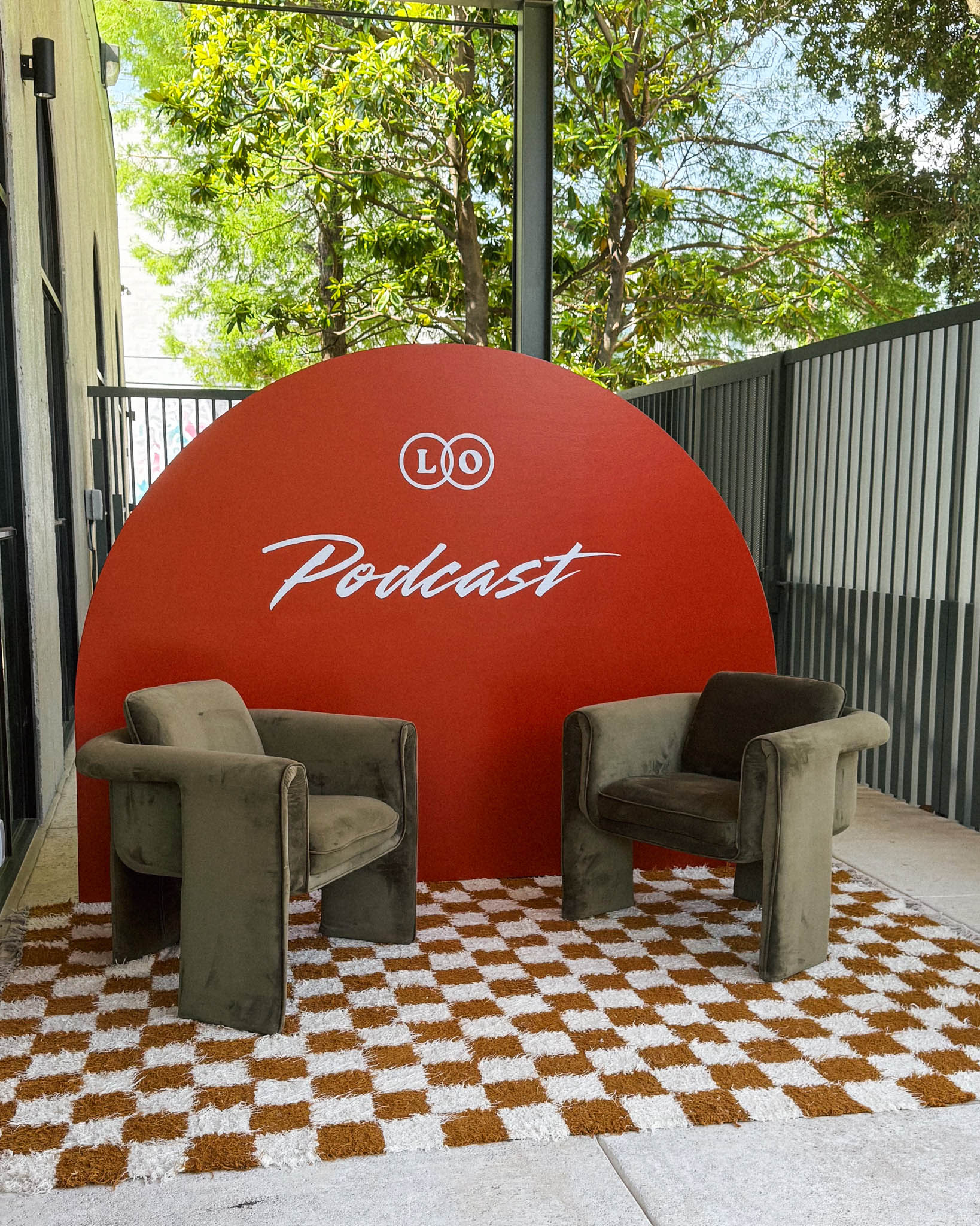We branded our 8×6′ Arch Wall as a backdrop for our Appletini Chairs, Checkerboard Shag Rug and Roman Side Table for the podcast recording space. The sign up for the podcast activation was at our Prohibition Petite Bar with a branded 4×8′ backdrop.