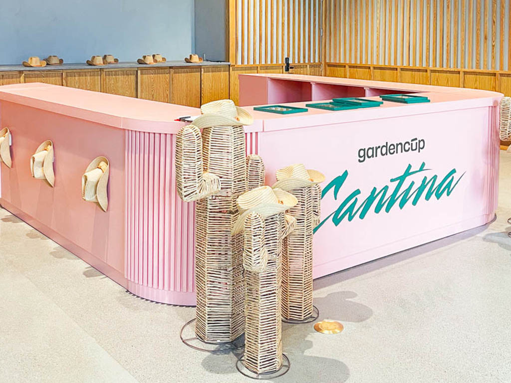 League of Originals transformed Assembly Hall’s Waller Room into a “cantina” activation for one of their sponsors, Gardencup. Gardencup’s branding is a little lighter and brighter, so they chose our pink Cosmopolitan Bar and we branded it with teal vinyl.