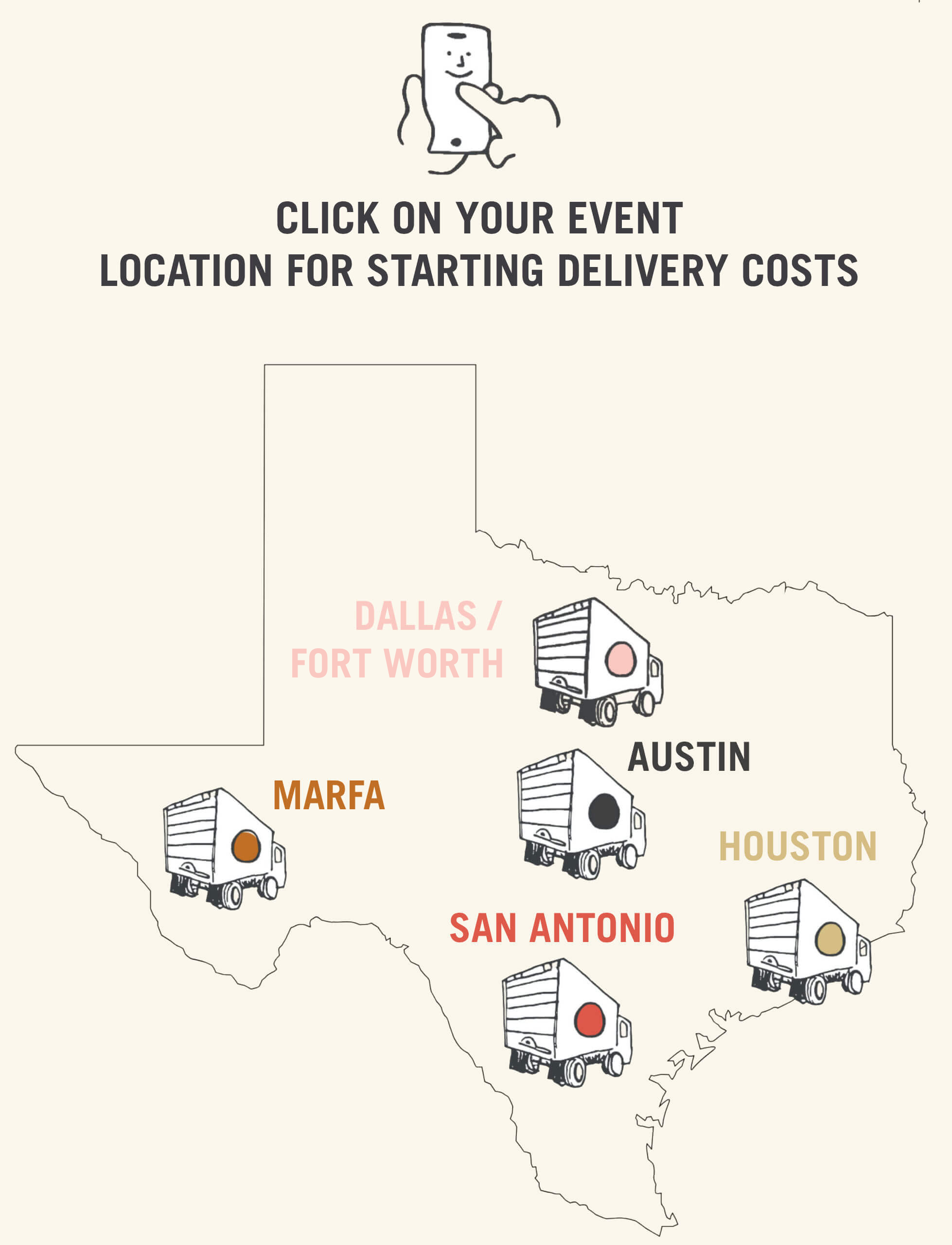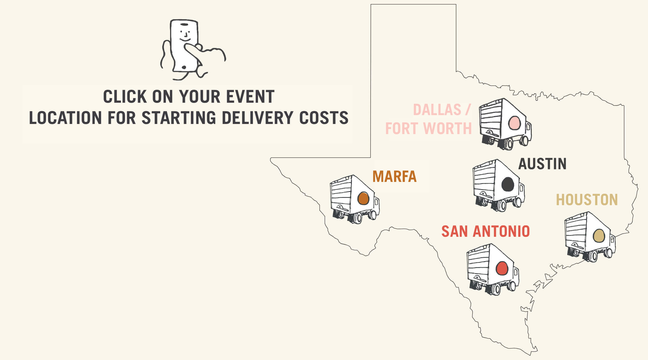 Delivery fees are charged prior to the event and determined based on a variety of factors, including staffing, vehicles, venue location + logistics, and more. Delivery fees include setup of our items, contingent on onsite direction from you or your team.