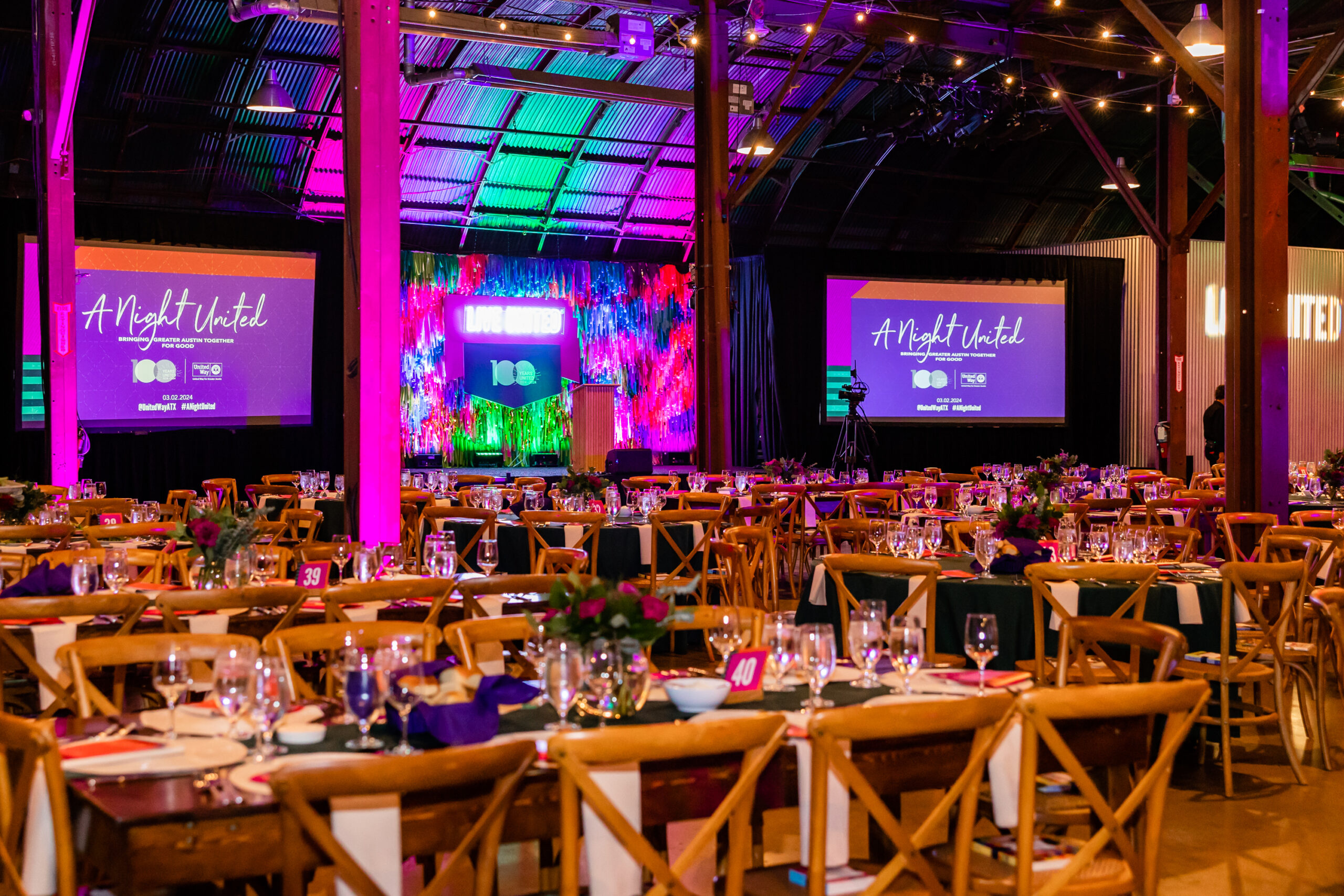 We were excited to help United Way celebrate 100 years of serving the Austin community as a sponsor of A Night United! Pink Cactus Productions gave everyone a lesson in how to deck out Fair Market, an iconic Quonset building in East Austin used for all sorts of events. Filling such a huge space, inside and out, can be a challenge so let’s chat about how they accomplished this and where our rentals came in to play.