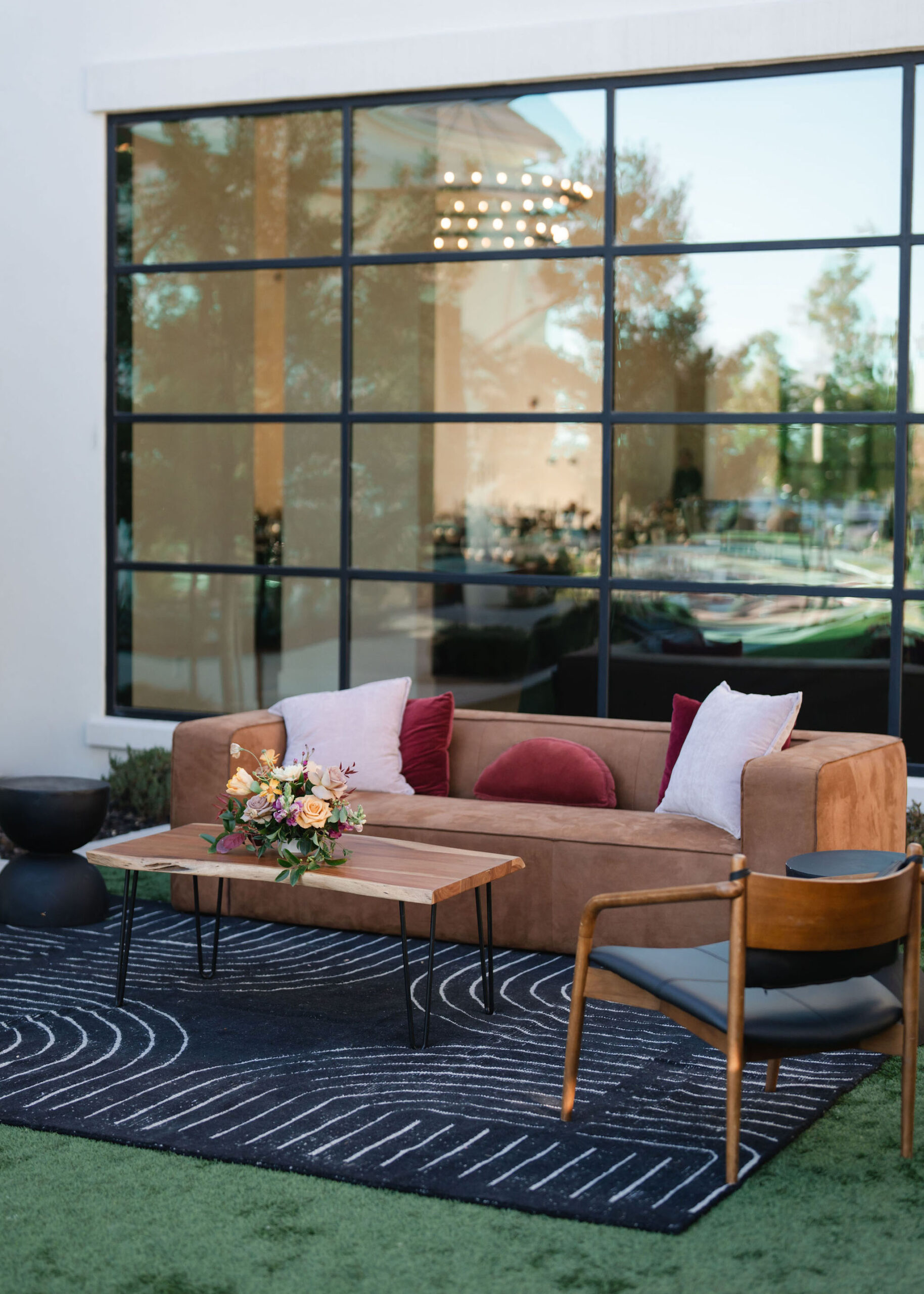 The first thing we would do is infuse color into the space with our Syrah Modular Sofa. We’d place this statement piece on the front lawn as part of a lounge so that it’s one of the first things your guests see! We’d also plant one of our Prohibition Bars on the lawn with Averna Cocktail Tables to create a cocktail hour moment.