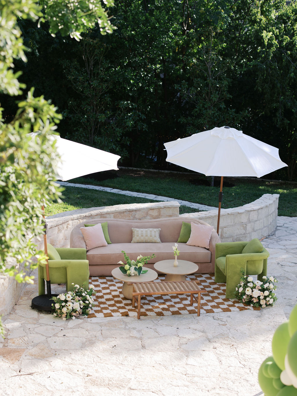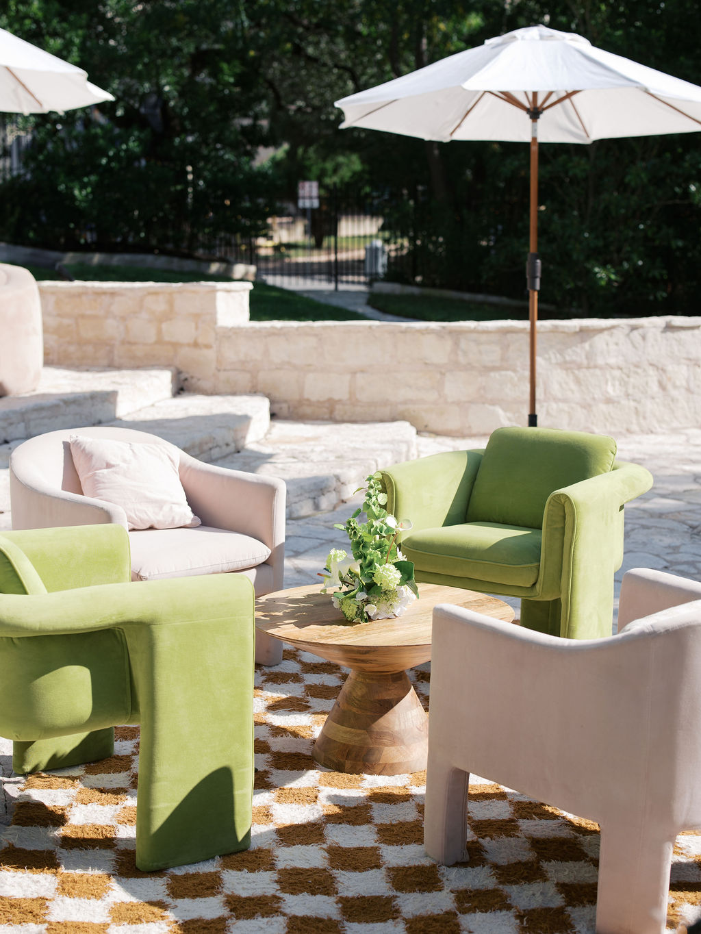 This category for us? No sweat. From the beginning, we’ve been transforming the atmosphere of a space with rentals. The key here is choosing rentals in colors and patterns that coordinate with all of the other decor you’ve chosen to provide a cohesive experience. Our Sales & Design Lead for this job selected our lime green Lime Drop Lounge Chairs and Lime Pillows to call back to the green in the photo op, paired with our Pink Lady Sofa, which brought in the feminine vibes needed to bring through the bridal shop brand.