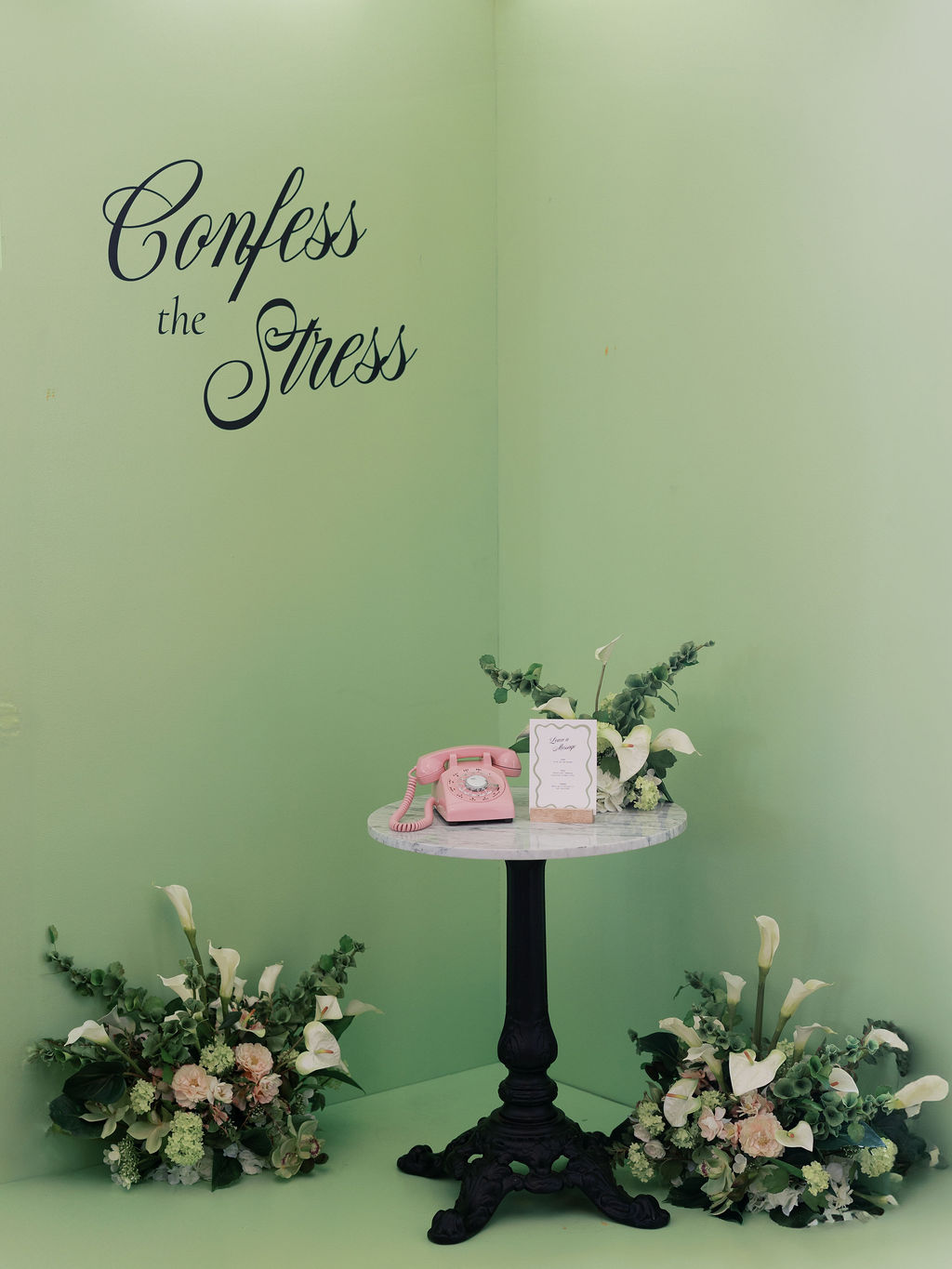 Think back to the last wedding you attended.. the part you probably remember the most was when you cried during the bride and grooms vows, or when you laughed with friends on the dance floor after a few glasses of champagne. Tapping into guests’ emotions creates memories and one emotion that most soon-to-be brides are feeling is unfortunately… stress. Revelry customized our Custom Color Photo Corner, with a calming shade of green and vinyl text, as a space where guests could “confess the stress” into a rotary phone.