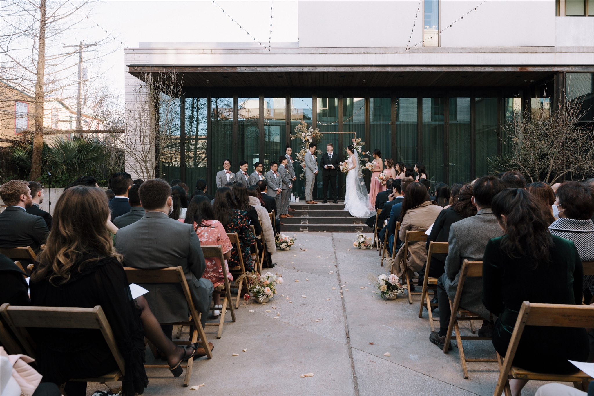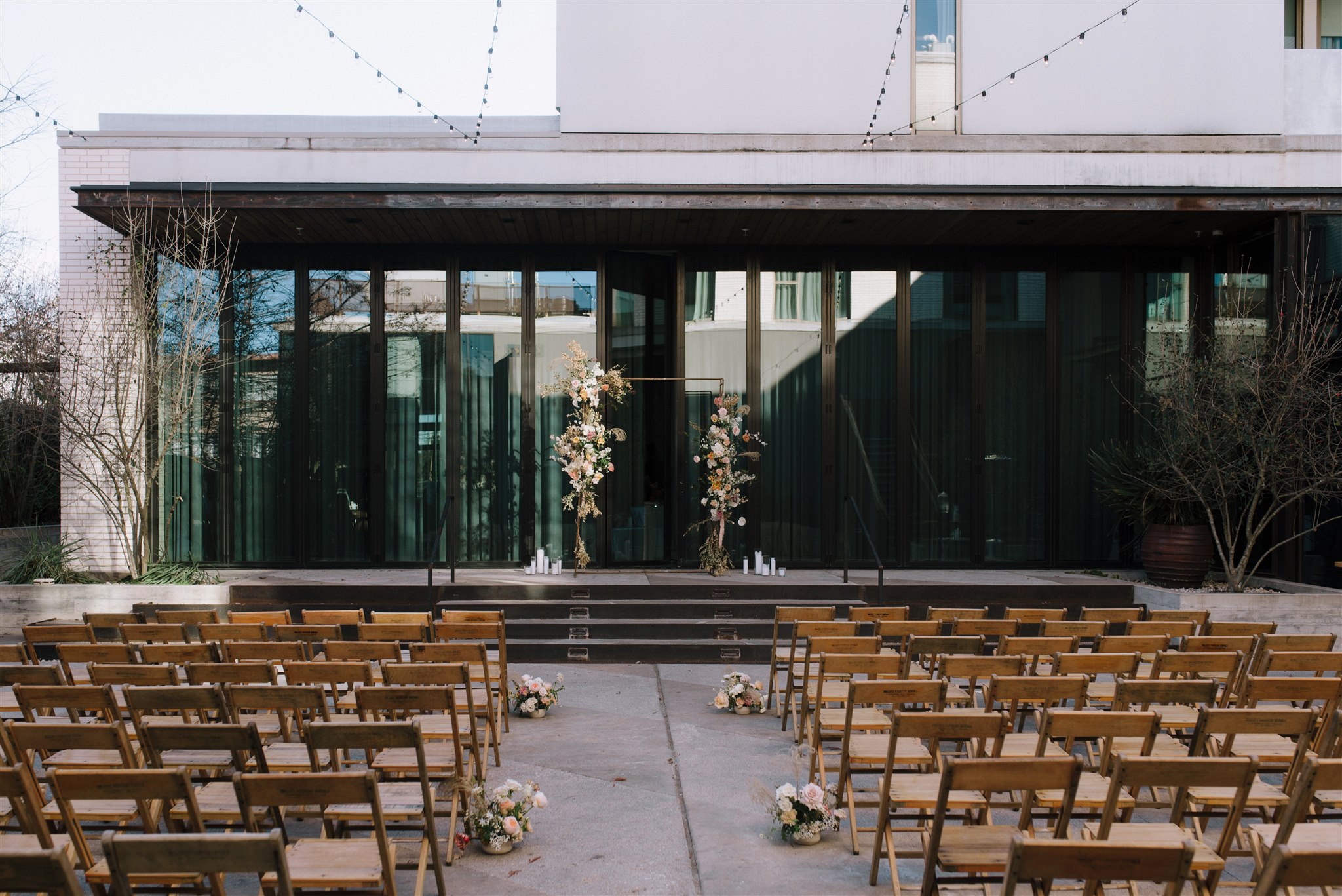 Our Old Pal Chairs at the ceremony added a rustic element, which juxtaposed the modern design of Austin’s South Congress Hotel. This little touch is what brought a warm, friendly vibe to a space with a lot of glass, steel, and concrete. Never underestimate the power of a good chair (at least, that’s our motto)! The couple then utilized the same Old Pal Chairs for reception. Not only is this budget-friendly, but by moving the chair to the reception, the style of the wedding was carried over into the reception space.