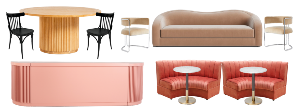 Instead of a normal tablecloth-adorned-dining-table, use our fluted wood Ciroc Round Dining Tables paired with our dark wood Manhattan Chairs for your reception. Add color and interest to your reception layout with colorful vignettes that mix bistro tables and lounge. Curved pieces of our pink Syrah Sofa can be placed side by side or back to back for cute, speakeasy vibes.