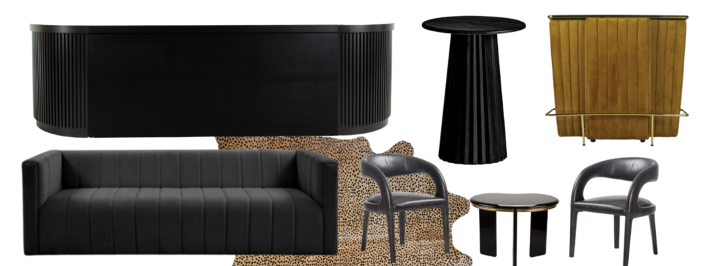 We’d start with rock n’ roll style lounges on the rooftop deck in front of our oversized, black Prohibition Bar or a few of our velvet Golden Cadillac Bars. Start designing your lounges around a Cheetah Print Rug and a big, black velvet, Monte Carlo Sofa. Our black Averna Cocktail Tables will fit right in with the design and provide a place for your guests set their drink while they dance and mingle with friends.