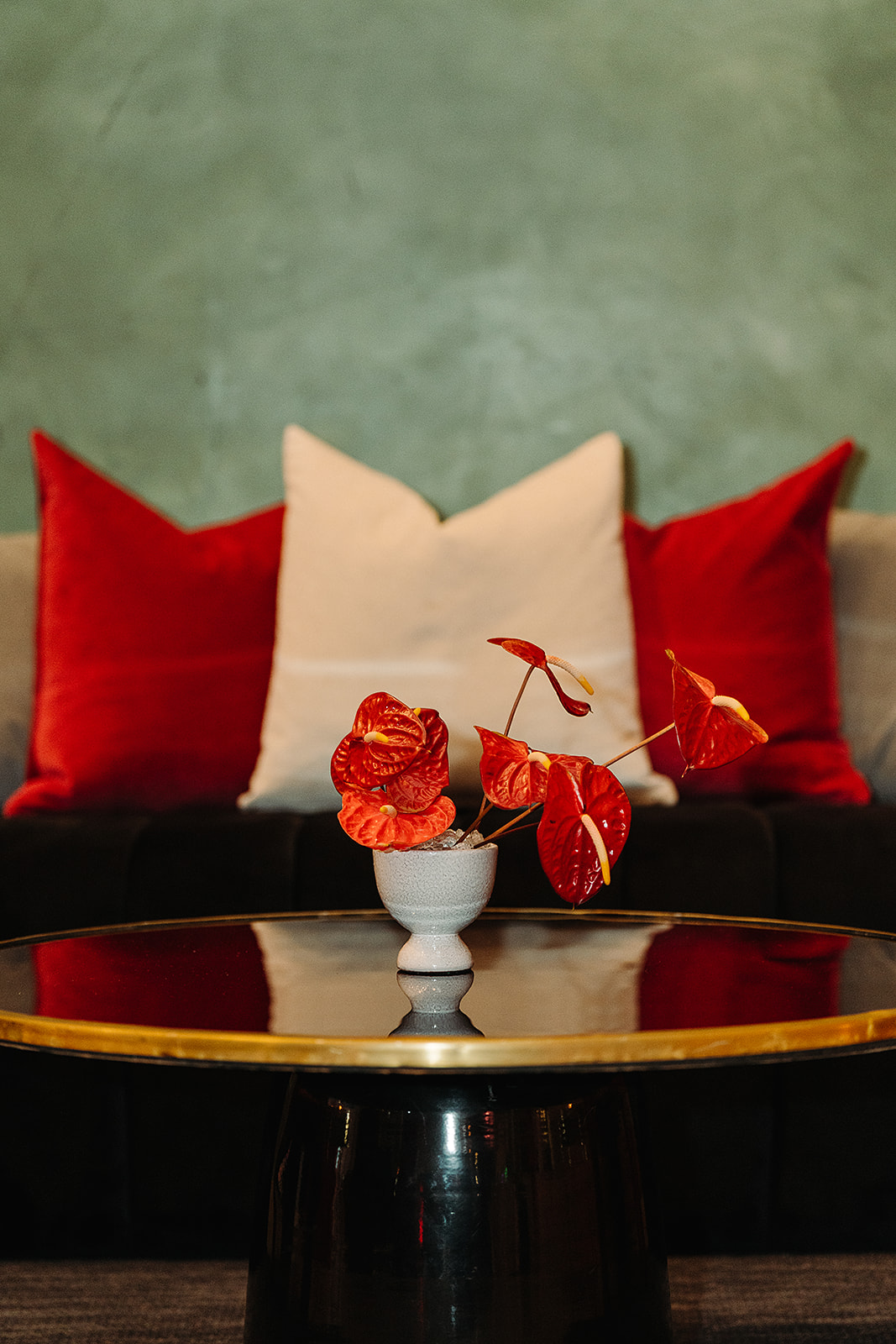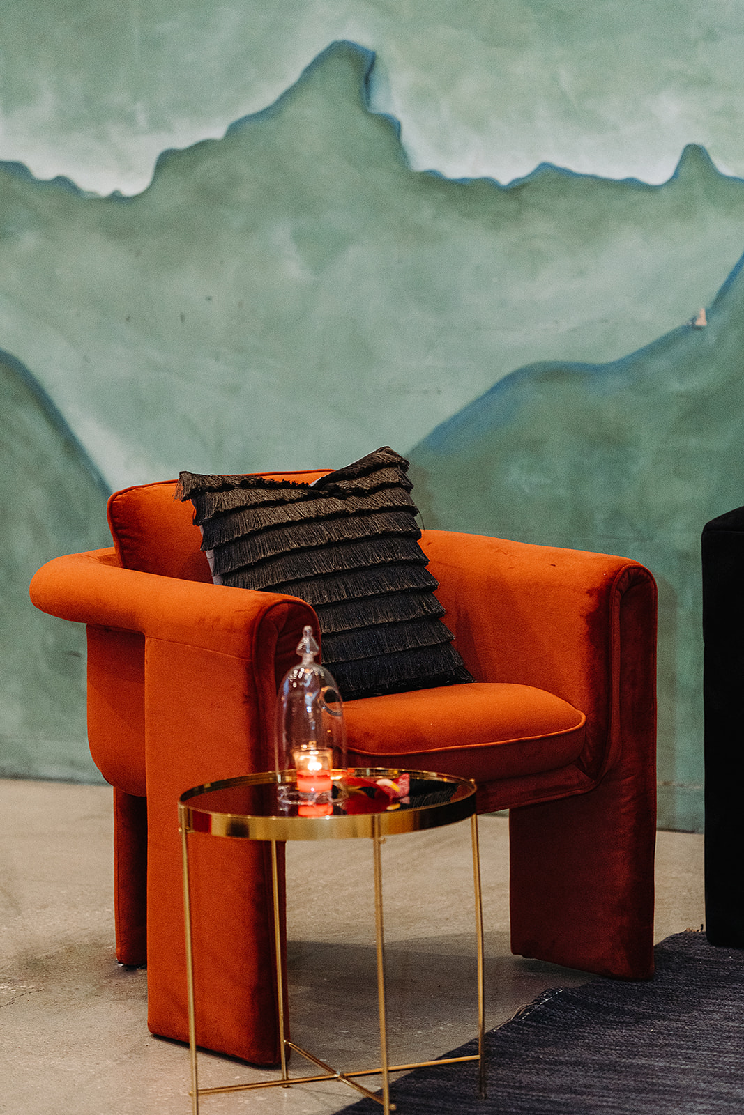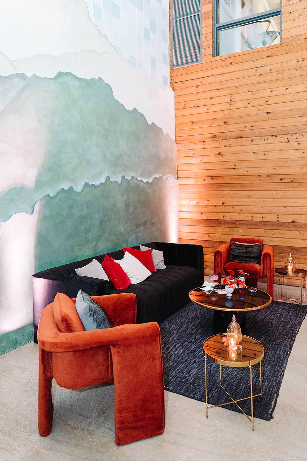 We designed a luxurious lounge for the evening full of shades of black and red velvet, starring our El Diablo Lounge Chairs, accented with gold from the coffee and side tables.