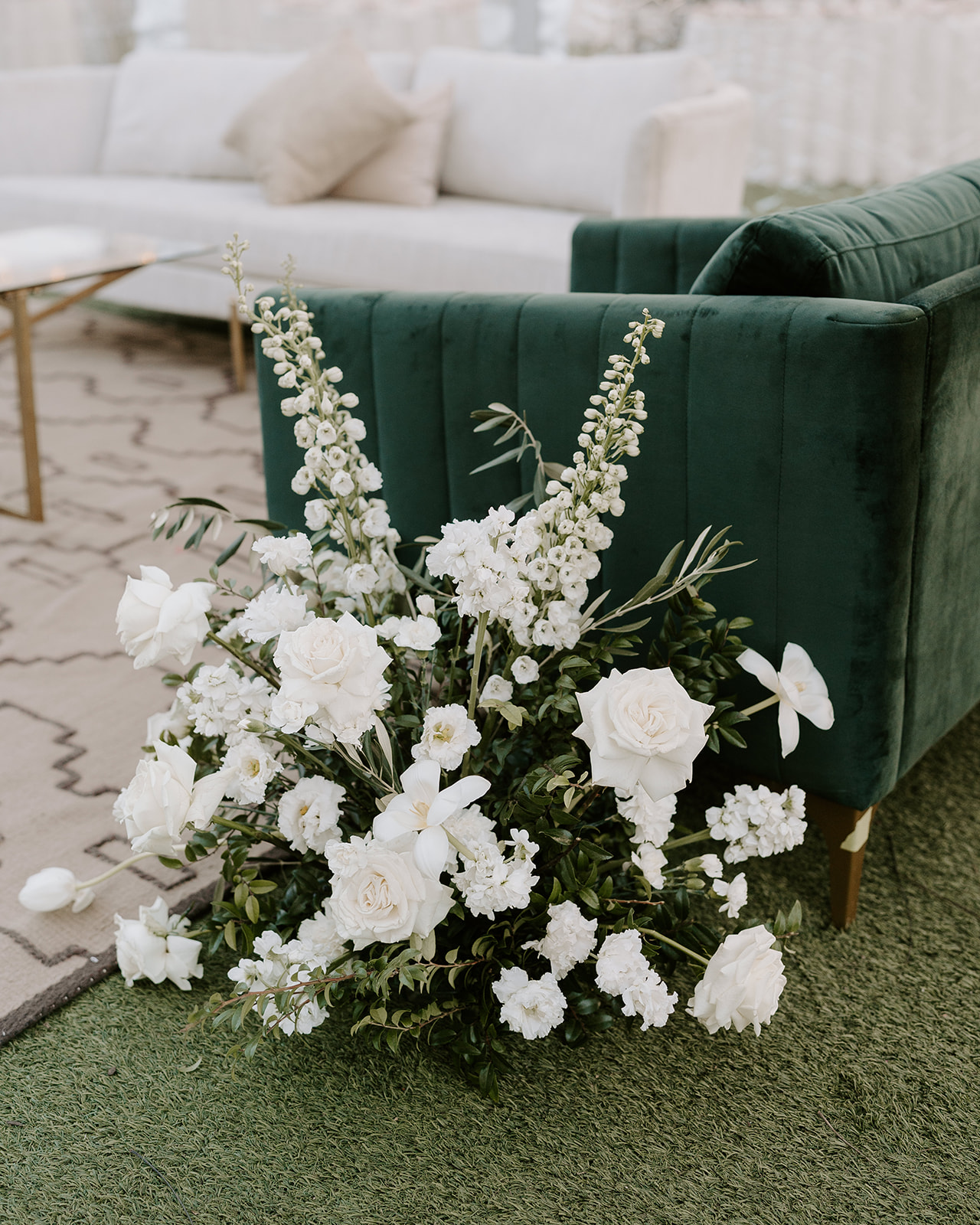 Mia fell in love with a few of our Pre-Styled lounges but ultimately chose one with our classic white Colada Sofa and Emerald Isle Lounge Chairs. The pop of emerald green velvet from the chairs tied in with the vines and greenery the couple had incorporated throughout their day.